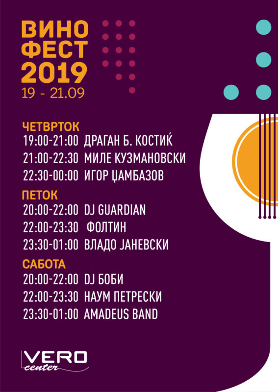 Музичката програма на „Вино фест 2019“ в четврток ќе почне во 19 часот и ќе трае до полноќ. В петок и в сабота ќе почне во 20 часот и ќе трае до 1 часот наутро.