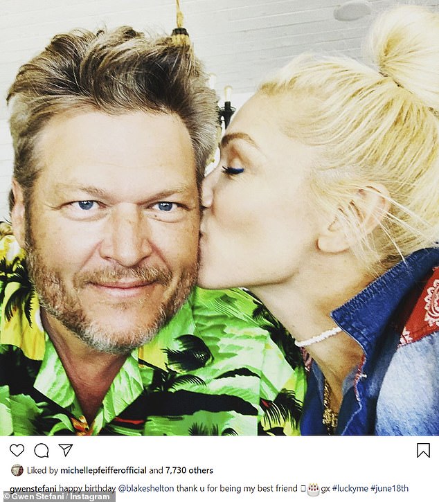 За оваа пригода, фронтменката на No Doubt (50) на својот Инстаграм објави слатко селфи на кое таа всадува голем бакнеж на насмеаниот образ на Блејк.