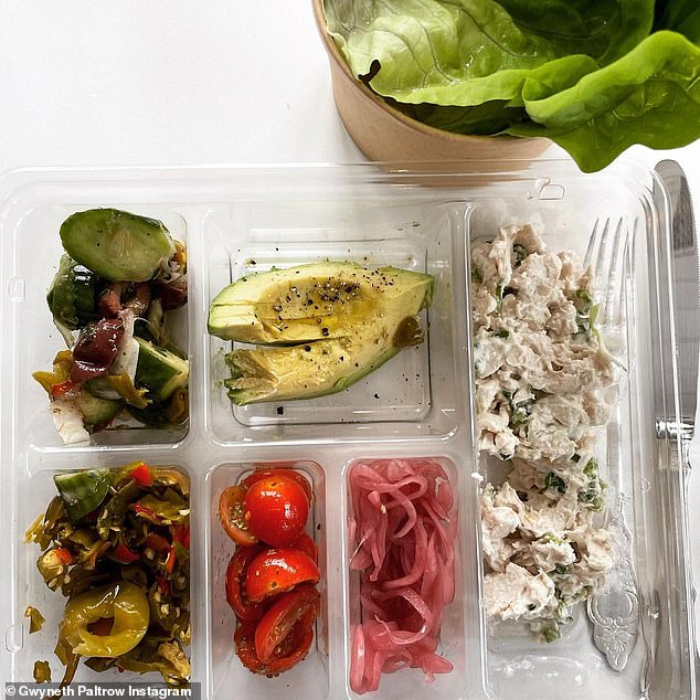 Во објава на „Инстаграм“ оскаровката (48) сподели фотографија со разновидна храна во сопствените пластични кутии со прегради на послужавник со сребрен прибор за јадење.