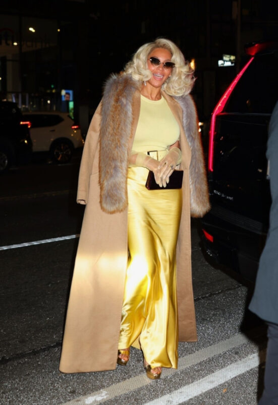 Судејќи по фотографиите, таа не е загрижена што зборува јавноста за неа. Уште повеќе, таа блескаше од среќа, облечена во светло жолта маица со кратки ракави и златно здолниште. Аутфитот го комплетираше со соодветен ремен, неутрална шминка, проѕирни ракавици и долга бунда.