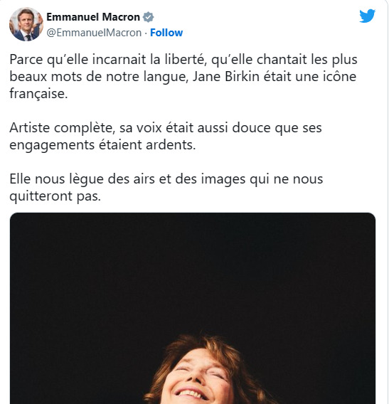 Францускиот претседател Емануел Макрон се прости од Биркин на социјалните мрежи.