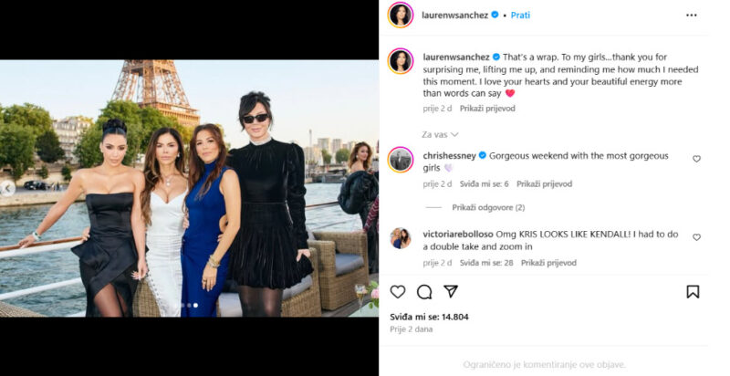 Санчез, сепак, се одлучи за погламурозна забава. Таа ги однесе своите најблиски пријателки, меѓу кои и познатите дами Ким Кардашијан, Кети Пери и Ева Лонгорија, во Франција. Тие ручаа во познатиот ресторан „Л’Авенју“, вечераа во „Лафајет“, а потоа отидоа на приватно крстарење по Сена, од каде имаа совршен поглед на Париз при зајдисонце.