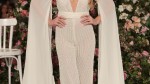 Инспириран е од 20-тите, а е посебен поради везот на деколтето и делумно проѕирниот дел од тил во нежно розова боја. Друг интересен детаљ е високата јака, која исто така е изработена од тил, но во друга боја. Со овој фантастичен фустан Дакота избра нежно розови чевли од „Валентино“, како и дискретен накит.