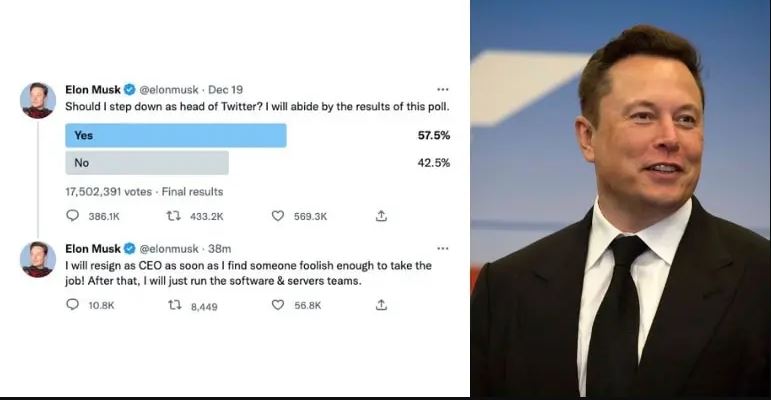 „Ќе поднесам оставка од функцијата главен извршен директор штом најдам некој доволно глупав за да ја прифати функцијата“, изјави Маск како одговор на анкетата спроведена на социјалната мрежа, која резултираше со 57.5 отсто од гласовите за негово повлекување.