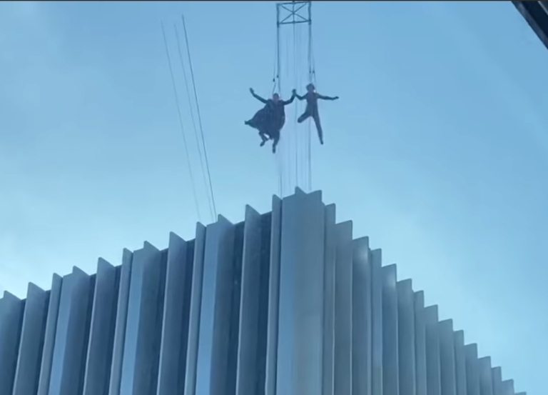 Двојници каскадери беа снимени како скокаат од облакодер додека изведуваат подвизи за да ѝ пркосат на смртта во претстојното четврто продолжение од научнофантастичниот серијал „Матрикс“.