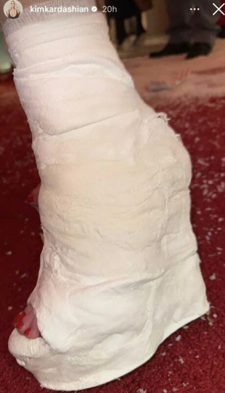 Ким Кардашијан неодамна го повреди стапалото, а на социјалните мрежи сподели фотографија од гипс во облик на потпетица, што предизвика бројни реакции кај обожавателите.