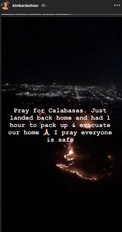 Ким Кардашјан и Канје Вест морале да го напуштат својот дом во Калабасас, Калифорнија. Поради пожарот што ја зафати областа, бројни жители беа евакуирани, а имотите, куќите и автомобилите беа уништени. Таа ги извести своите следбеници на социјалните мрежи дека заминала од куќата еден час откако се вратила дома, и ѝдозволиле да земе само неколку работи.