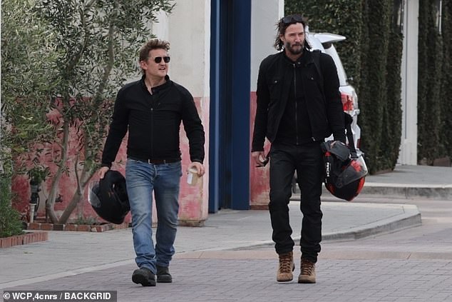 Кијану (57) носи црна јакна преку темни фармерки и изгребани кафени чизми додека се качува на својот мотоцикл пред дневното патување.