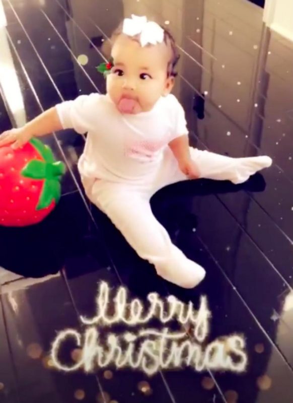 Потоа, Клои објави фотографија на која Тру се игра на подот во розов костим, додека нејзината мајка вели „Среќен Божик”.