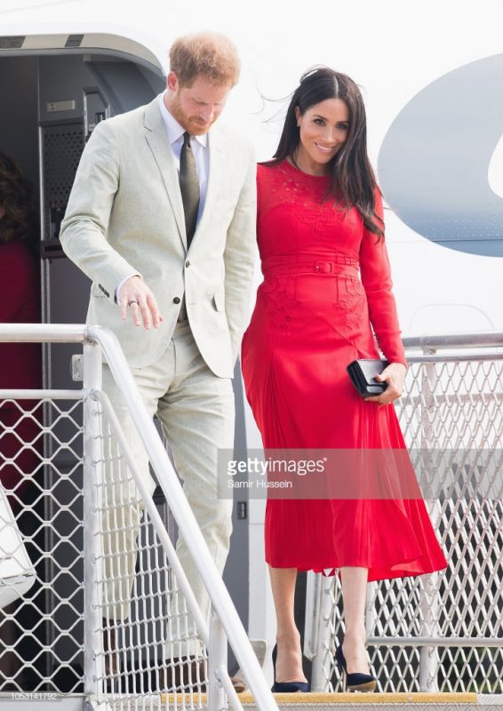 A minor fashion faux pas for Meghan, as the label of her gorgeous red Self Portrait dress can be seen hanging down as she walks the red carpet in #Tonga https://t.co/RtpTW86PoE