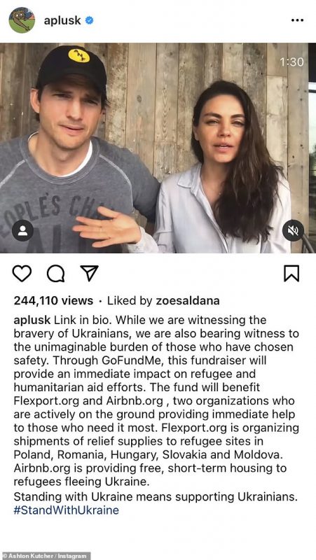 Актерката Мила Кунис, родена во Украина, и нејзиниот сопруг Ештон Качер соопштија дека ќе соберат над 3 милиони долари како донации за да помогнат во обезбедувањето непосредна хуманитарна помош за украинските бегалци што ја напуштаат земјата разурната од војната.