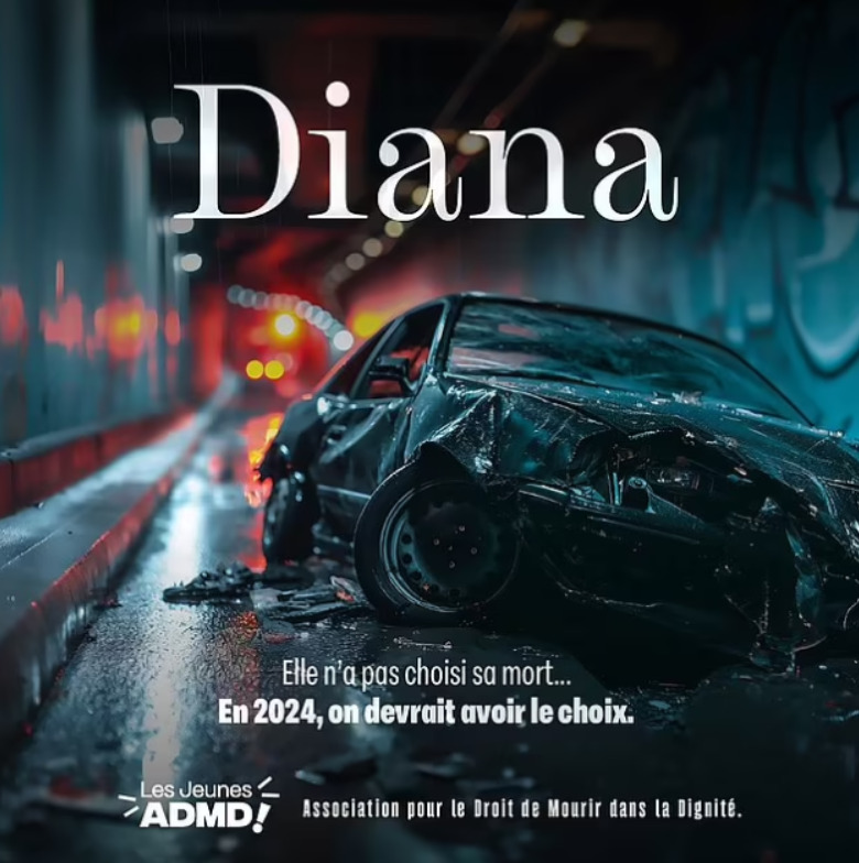 Француската организација ADMD, која се залага за евтаназија, сподели на социјалните мрежи постер кој ја пресоздава ужасната сцена во парискиот тунел од 1997 година, каде што загина принцезата Дијана.