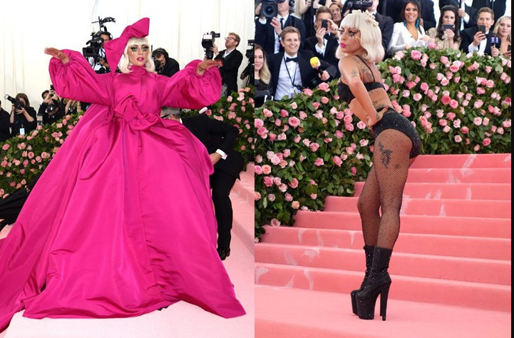 Странските медиуми црвениот тепих на „Мет гала 2019“ го прогласија за најскандалозен досега, а за тоа секако придонесе и Лејди Гага, која изведе стриптиз. Пејачката првин се појави во џиновски розов фустан со седумметарски вел, што се влечеше зад неа.