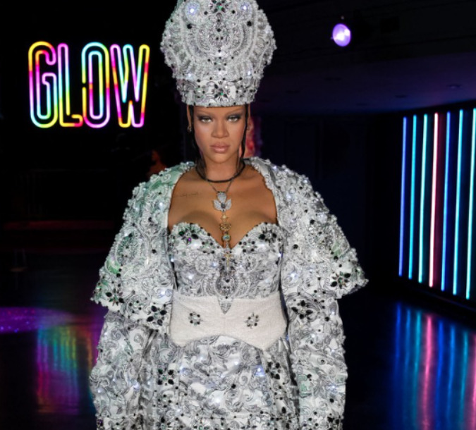 Ријана пристигна на „Мет гала 2018“ во специјално издание. Таа носеше краток корсет-фустан прекриен со бели, сребрени и црни мониста и здолниште со ист дизајн, врзано со голем ремен. На главата имаше шапка инспирирана од дизајнот на папската капа.
