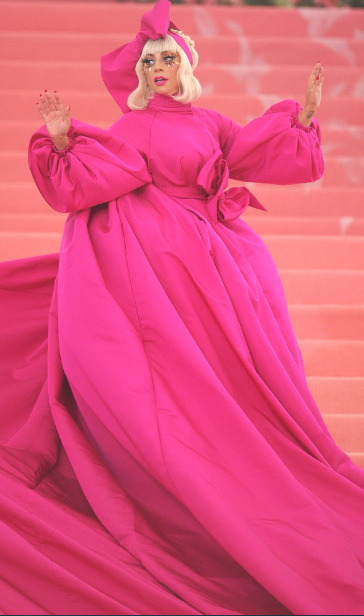 Странските медиуми црвениот тепих на „Мет гала 2019“ го прогласија за најскандалозен досега, а за тоа секако придонесе и Лејди Гага, која изведе стриптиз. Пејачката првин се појави во џиновски розов фустан со седумметарски вел, што се влечеше зад неа.