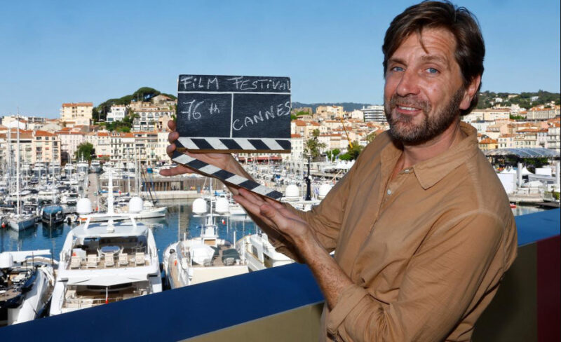 Рубен Осланд, претседател на жирито на 76. Кански филмски фестивал, држи филмска клапа додека позира на денот на отворањето.