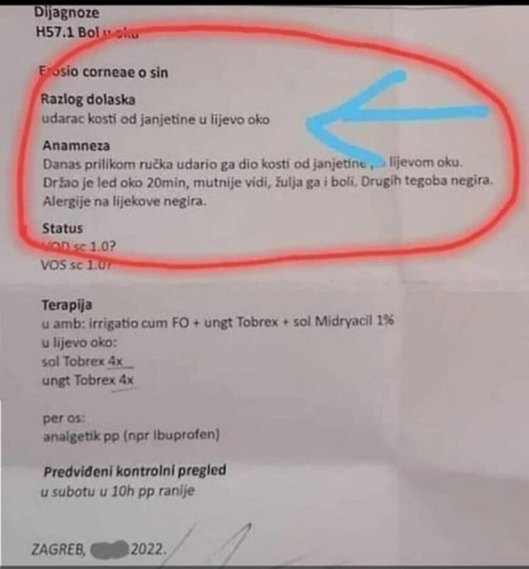 „Денеска за време на ручек го удрило парче јагнешка коска во пределот на левото око. Држел мраз околу 20 минути, видот му е заматен, го гребе и има болки. Негира какви било други тегоби. Негира каква било алергија на лекови“, се наведува во извештајот.