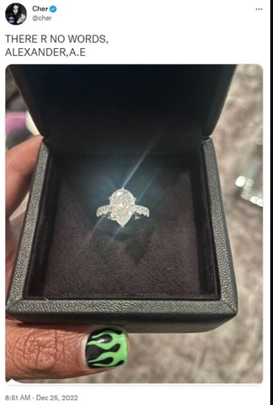 Шер се огласи на „Твитер“ за да го сподели фотографија со масивен дијамантски прстен, што ги натера фановите да шпекулираат дека можеби се свршила со музичкиот продуцент Александар А. Е. Едвардс.