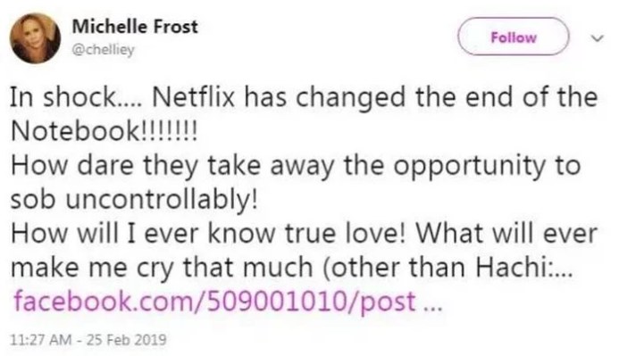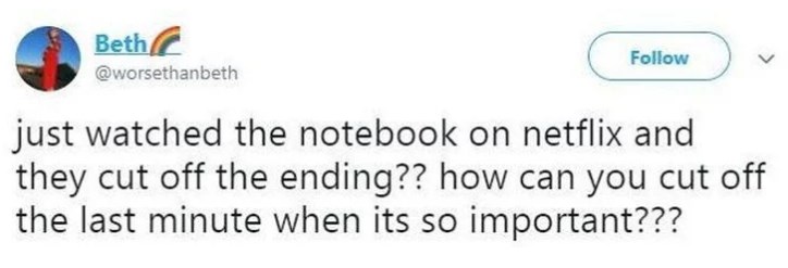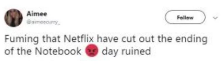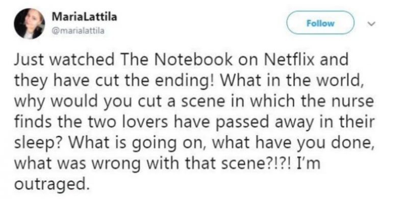 „Бесна сум бидејќи Нетфликс го отсече крајот на Notebook. Ми го уништивте денот“.