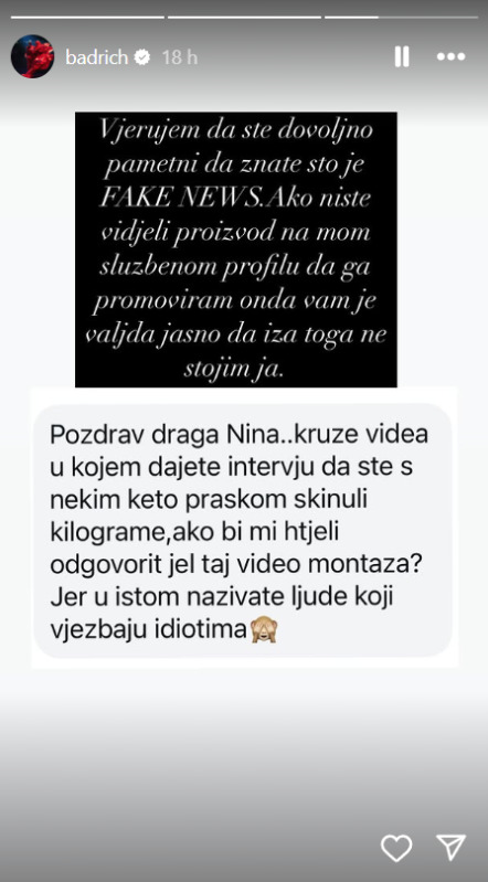 „Поздрав, драга Нина, кружи видео во кое даваш интервју и кажуваш дека си ослабела со некој кето прав. Ако сакаш да ми одговориш, дали тоа видео е монтажа? Затоа што во него ги нарекуваш луѓето кои вежбаат – идиоти“, ѝ напишала една жена.
