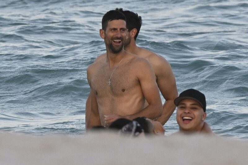 36-годишниот српски тенисер пристигна на плажата откако се смести во хотелот, а уживаше во пливањето и дружењето со своите пријатели и не пропушти да се фотографира со фановите.