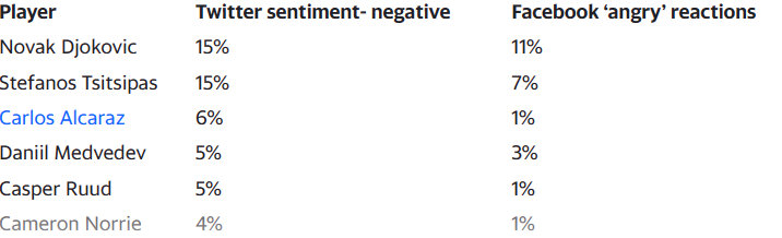 Според добиените податоци, 15 отсто од твитовите во кои се споменува Ѓоковиќ во последните 16 месеци биле негативни и 11 отсто од интеракциите на „Фејсбук“ биле исто така негативни.