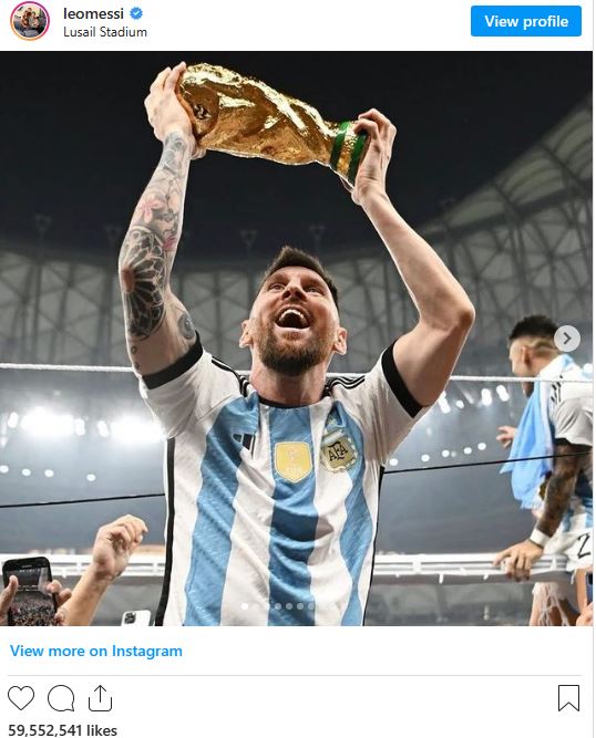 Објавата што Лионел Меси ја сподели на „Инстаграм“ откога Аргентина го освои Светското првенство во Катар стана најлајкуваната објава во историјата на социјалната мрежа.