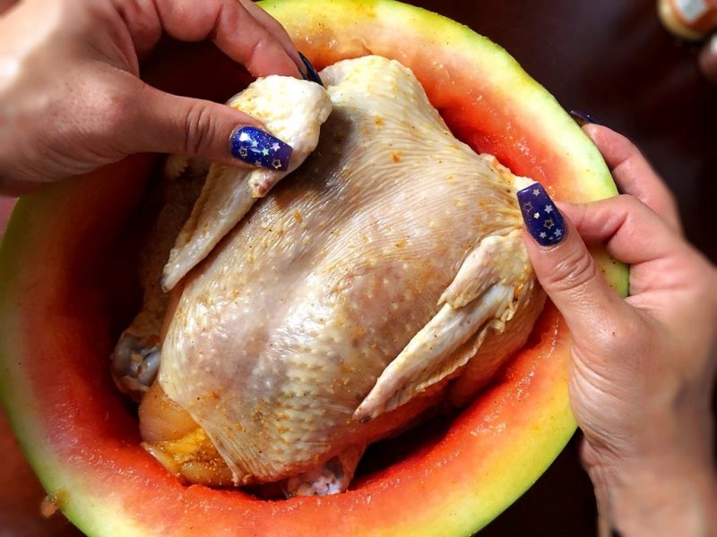 Пилешко печено во лубеница: необичен рецепт што не сте го приготвувале досега