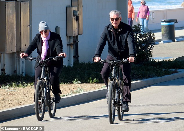Пирс Броснан и сопругата Кили Шеј Смит уживаа во возење велосипед во Малибу, Калифорнија, во студената зимска недела.