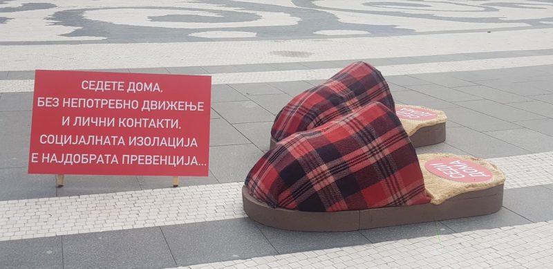 Големи собни влечки се поставени на плоштадот во Скопје со порака „Седете дома“.