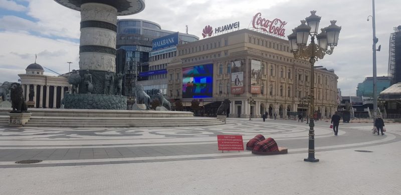Уметничка герила – собни влечки на плоштадот во Скопје со порака „Седете дома“