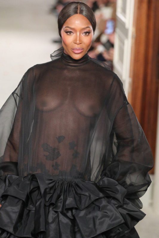 Некогаш најплатениот модел во светот, Наоми Кембел, минатата година најави дека планира да оди во „пензија”, но сепак одлучи да прошета на модната писта и тоа сосема гола во проѕирен фустан што ги откри нејзините гради и задникот.