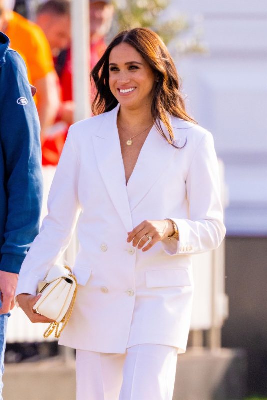 Таа на себе има елегантен бел костум, бели чевли и мини чанта со златен оков, а Хари го носи својот препознатлив костум во морнарко сина боја додека се смешка и им мавта на присутните.