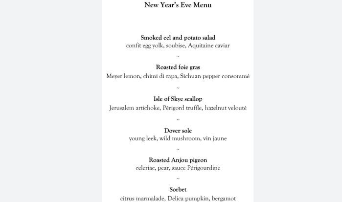 Во ресторанот „Гордон Ремзи“, кој има и три Мишелин-ѕвездички, новогодишната вечера ќе чини 400 фунти по лице, но пијалаците не се вклучени во цената. Менито ќе вклучува специјалитет наречен Duck tea, јастог, власец и пециво со телешко.