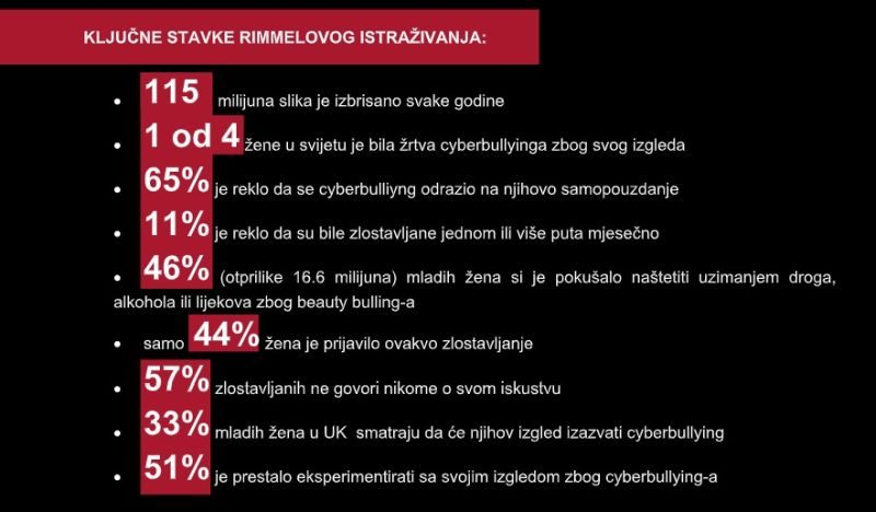 Во 2017 година „Римел“ интервјуира 11.000 жени на возраст од 16 до 25 години, кои ги споделија своите искуства за бјути сајбер-малтретирањето. Истражувањето го откри вистинскиот степен на овој проблем и ни даде увид во негативното влијание врз менталното и емоционалното здравје на младите.