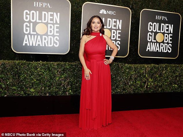 Салма Хајек ја истакна својата одлична фигура во романтичен црвен фустан додека присуствуваше на наградите „Златен глобус 2021“ во Беверли Хилс во неделата.