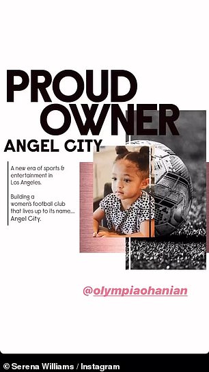 38-годишната тенисерка сподели рамка за своите 12,5 милиони следачи на „Инстаграм“, на која пишува „Горд сопственик на Angel City“ со фотографии од ќерката и фудбалска топка.
