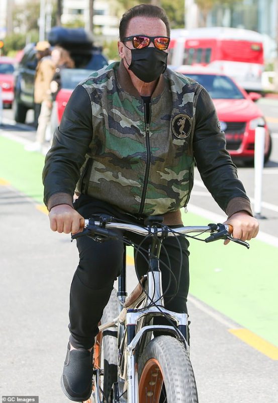 Во понеделникот, облечен во маскирна јакна, „терминаторот“ уживаше во попладневно возење велосипед со пријател низ неговата елитна населба Брентвуд во Лос Анџелес.