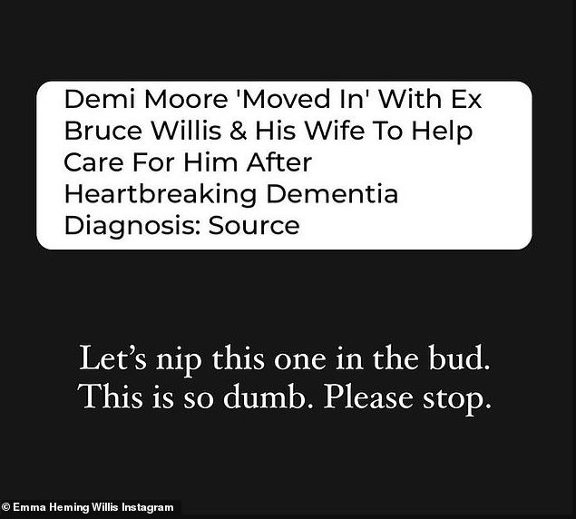 Сопругата на холивудскиот актер Брус Вилис, Ема Хеминг, ги демантира шпекулациите дека неговата поранешна сопруга Деми Мур се преселила кај нив за да помогне во грижата за актерот по дијагностицирањето деменција.