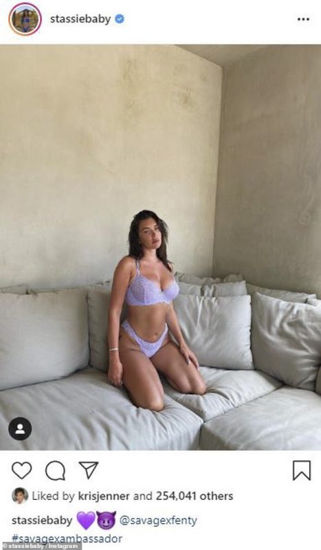 На фотографиите, 23-годишната Стаси на себе има цветна долна облека од тантела и слична комбинација во бела боја – од брендот за долна облека Savage x Fenty на музичката дива Ријана. Оваа линија е дел од летната кампања „Љубовна танела“ креирана во соработка со Адам Селман.
