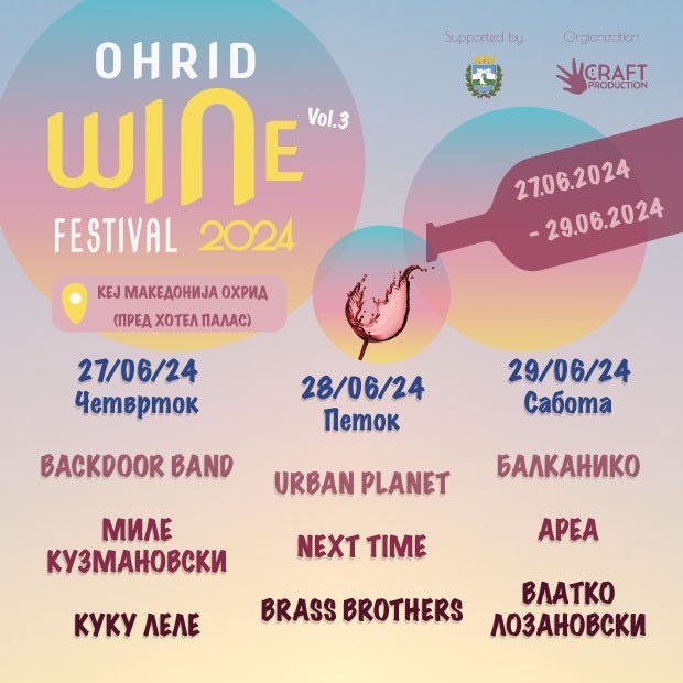 Оваа година фестивалот Охридскиот вински фестивал ќе се одржи на 27, 28 и 29-ти јуни на улица „Кеј Македонија“ пред хотелот Палас во Охрид, а посетителите ќе имаат можност да дегустираат од најубавите македонски вина, вкусна храна и одлична културно – музичка програма со македонски музички артисти.