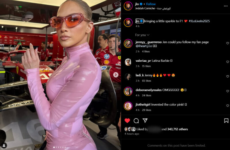 Лопез за оваа пригода избра тесен розов комбинезон од латекс, кој ја истакна нејзината фигура. „Донесуваме малку сјај во Ф1“, напиша таа покрај фотографиите кои за само неколку часа им се допаднаа на речиси 800.000 луѓе.