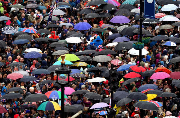Типично британски. Малку кој беше изненаден од дождот, илјадници се појавија во кабаници за да се постројат на улиците на Лондон.