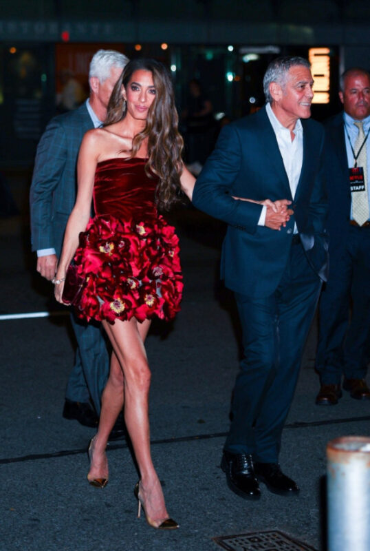 Клуни не заостануваше далеку зад својата сакана, но не успеа да ја засени. За својата премиера, тој избра тегет одело и бела кошула, без вратоврска.