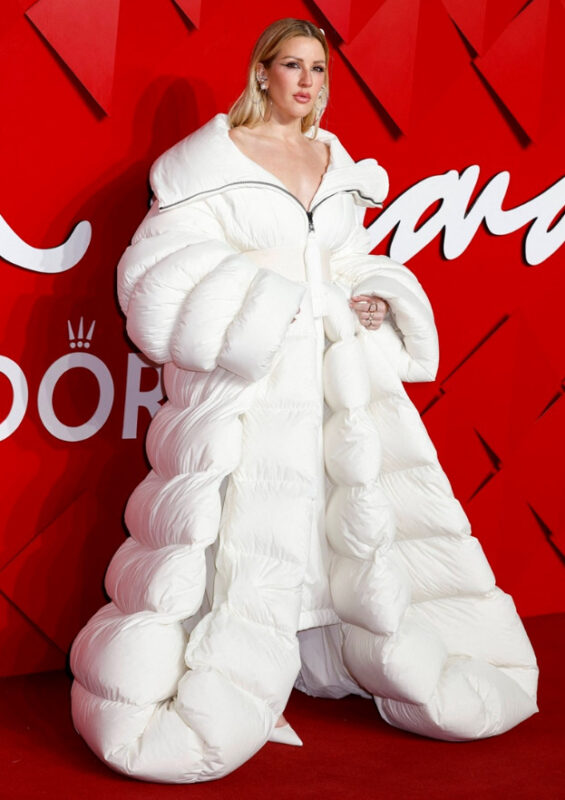 Таа се појави во фустан од вештачко крзно во светло сина боја, украсен со црн корсет, а впечатокот дополнително го зголеми со кожени ракавици до лактот и голема светло сина крзнена капа.