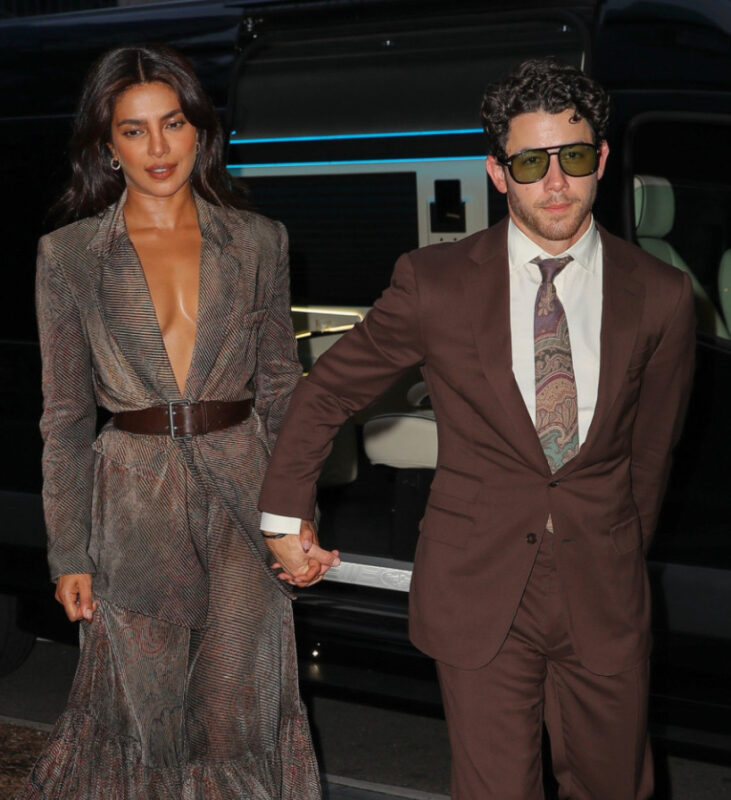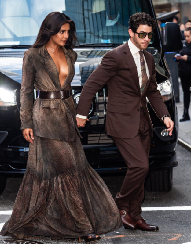 Таа дојде на модната ревија со својот 11 години помлад сопруг Ник Џонас, кој исто така покажа дека ги следи модните трендови, и се појави во кафеав костум и кафеави чевли, а софистицираните панталони и јакна ги надополни со кафеава вратоврска и бела кошула. Тие беа совршено координирани модно и трпеливо позираа за собраните фотографи.
