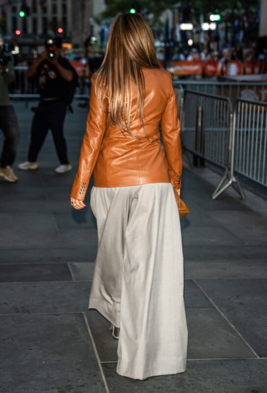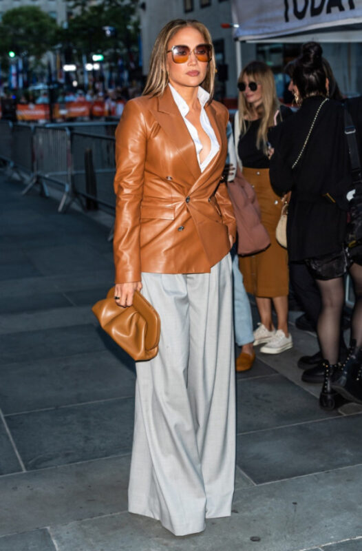 За неодамнешното гостување во „Тудеј шоу“, таа избра фантастична комбинација од кафеава кожена јакна и лелеави, плисирани широки панталони.
