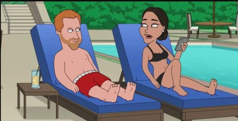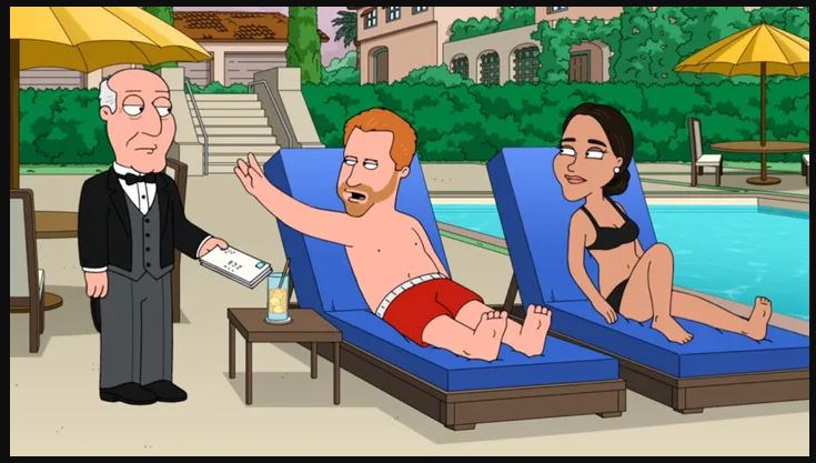 Во серијата, сега во својата 23. сезона, цртаните верзии на војводата и војвотката од Сасекс се појавуваат покрај базен откако главниот лик Питер Грифин се споредува себеси со кралската двојка додека седи во бар со своите пријатели.