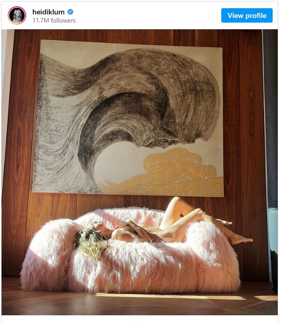 Супермоделот (50), позната како кралица на костимите за Ноќта на вештерките, сподели фотографија на која лежи целосно гола на розова софа со рацете кои ѝ ги покриваат градите, а зад неа има голема слика на два лика.