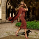 Меѓу тетоважите што го привлекоа вниманието се голем бенгалски тигар, свети будистички молитви и разни симболи на љубов и мир. Џоли носеше елегантен фустан со наметка од колекцијата Alberta Ferretti FW25. Отворениот дизајн на грбот им овозможи на тетоважите да дојдат до израз. Таа ја надополни целата комбинација со лакирани кожни чевли.